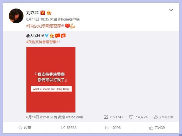 Artis berdarah campuran China-Amerika ini mengunggah gambar dukungan terhadap pihak kepolisian Hong Kong dalam menghadapi massa anti pemerintah. Liu Yifei mengunggah ulang foto dari Partai Komunis China, The People Daily di akun Weibo miliknya dengan 66 juta pengikut.