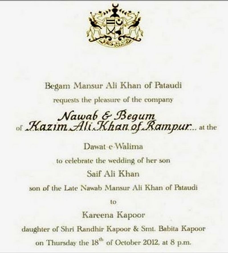 Di tahun 2012 kabar pernikahan Saif Ali Khan dan Kareena Kapoor menjadi berita utama. Sayangnya, tidak banyak diketahui tentang pernikahan mereka. Hanya saja sempat beredar foto undangan milik keduanya. Undangan pernikahan itu pun tampak begitu sederhana, namun terlihat elegan dengan lambang Pataudi yang menghiasi bagian atasnya.
