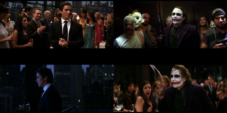 Pandangan ini telah ada bertahun-tahun bahwa Joker dan Batman adalah dua karakter dalam satu koin. Karakter keduanya secara alamiah bertentangan. Saat adegan pesta, baik Bruce dan Joker datang dengan mencari-cari minuman dan Harvey di antara kerumuman.Yang terpenting, keduanya memakai teror untuk mencapai tujuan, hanya kebetulan saja Batman ada di sisi kita.