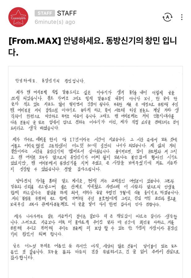 Awalnya pernikahan Changmin TVXQ berhembus pada Juni 2020. Tak berselang lama, SM Entertainment membenarkan kabar tersebut. Changmin TVXQ juga membuat surat bertuliskan tangan kepada para penggemar. Dalam surat tersebut, ia meminta maaf jika beberapa penggemarnya kecewa atas kabar pernikahannya.