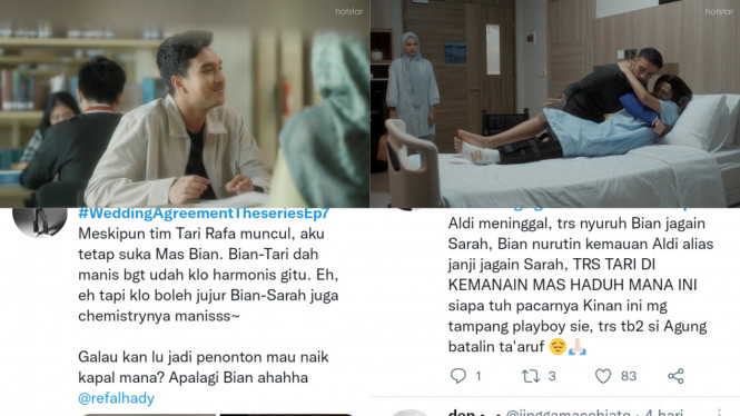 "Kesel bgt SAMA BIAN, Aldi meninggal, trs nyuruh Bian jagain Sarah, Bian nurutin kemauan Aldi alias janji jagain Sarah, TRS TARI DI KEMANAIN MAS HADUH MANA INI siapa tuh pacarnya Kinan ini mg tampang playboy sie, trs tb2 si Agung batalin ta'aruf ????????????" timpal akun Twitter lainnya.